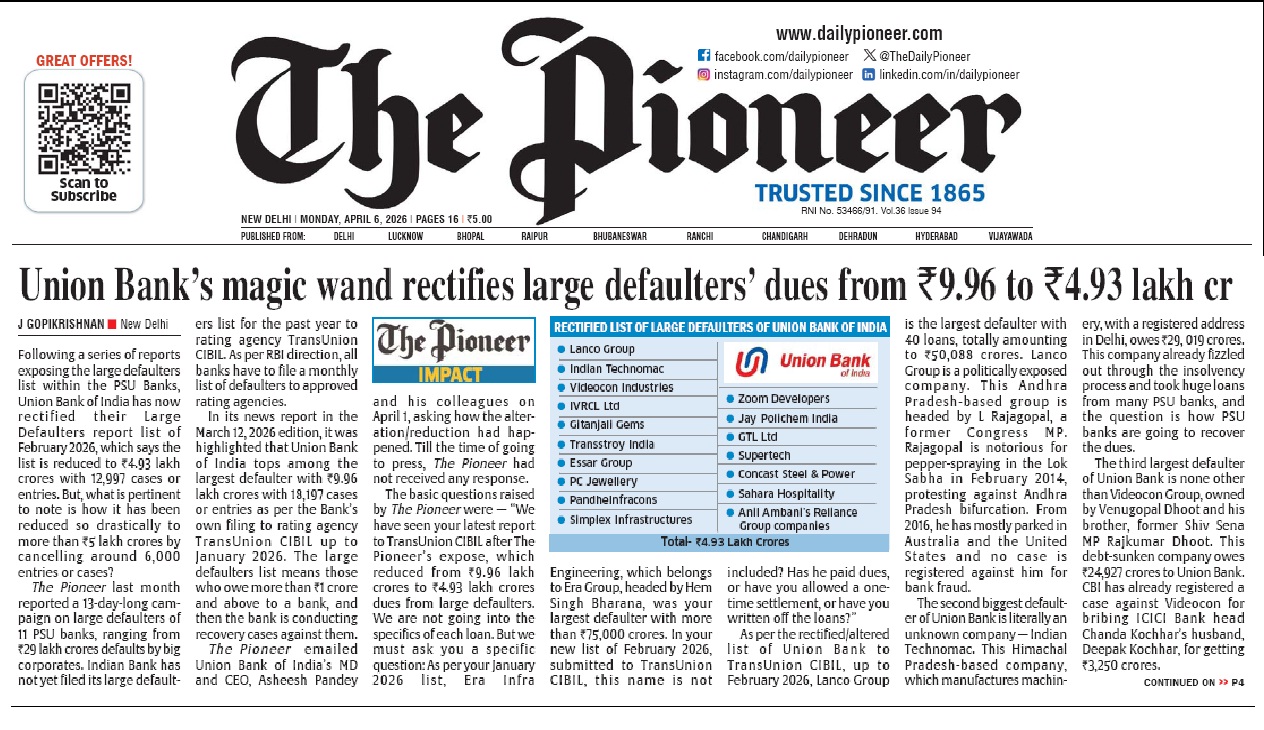 J Gopikrishnan New Delhi / April 06, 2026 Following a series of reports exposing the large defaulters list within the PSU Banks, Union Bank of India has now rectified their Large Defaulters report list of February 2026, which says the list is reduced to INR 4.93 lakh crores with 12,997 cases or entries. But, what…