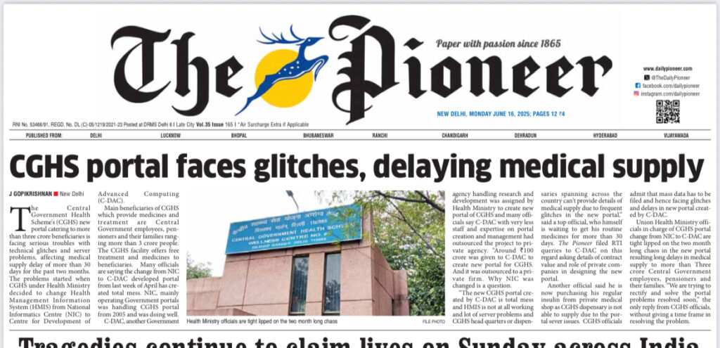 “The new CGHS portal created by C-DAC is total mess and HMIS is not at all working and lot of server problems and CGHS head quarters or dispensaries spanning across the country can’t provide details of medical supply due to frequent glitches in the new portal,” said a top official, who himself is waiting to get his routine medicines for more than 30 days. The Pioneer filed RTI queries to C-DAC on this regard asking details of contract value and role of private companies in designing the new portal.