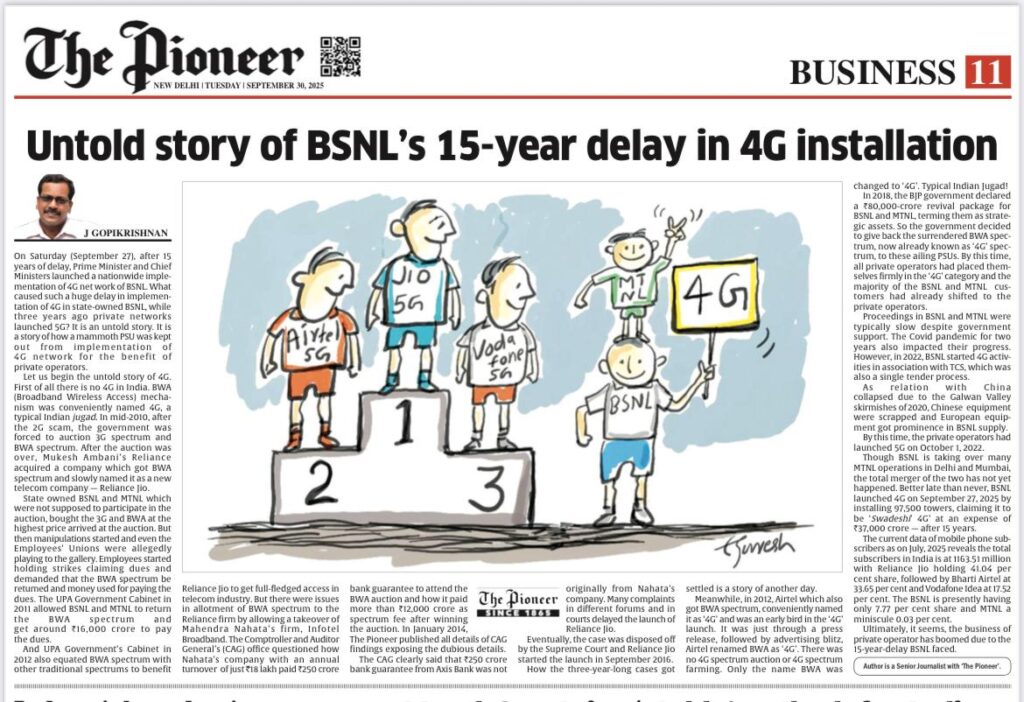 On Saturday (September 27), after 15 years of delay, the Prime Minister and Chief Ministers launched a nationwide implementation of 4G network of BSNL. What caused such a huge delay in the implementation of 4G in state-owned BSNL, while three years ago, private networks launched 5G? It is an untold story. It is a story of how a mammoth PSU was excluded from the implementation of the 4G network for the benefit of private operators.