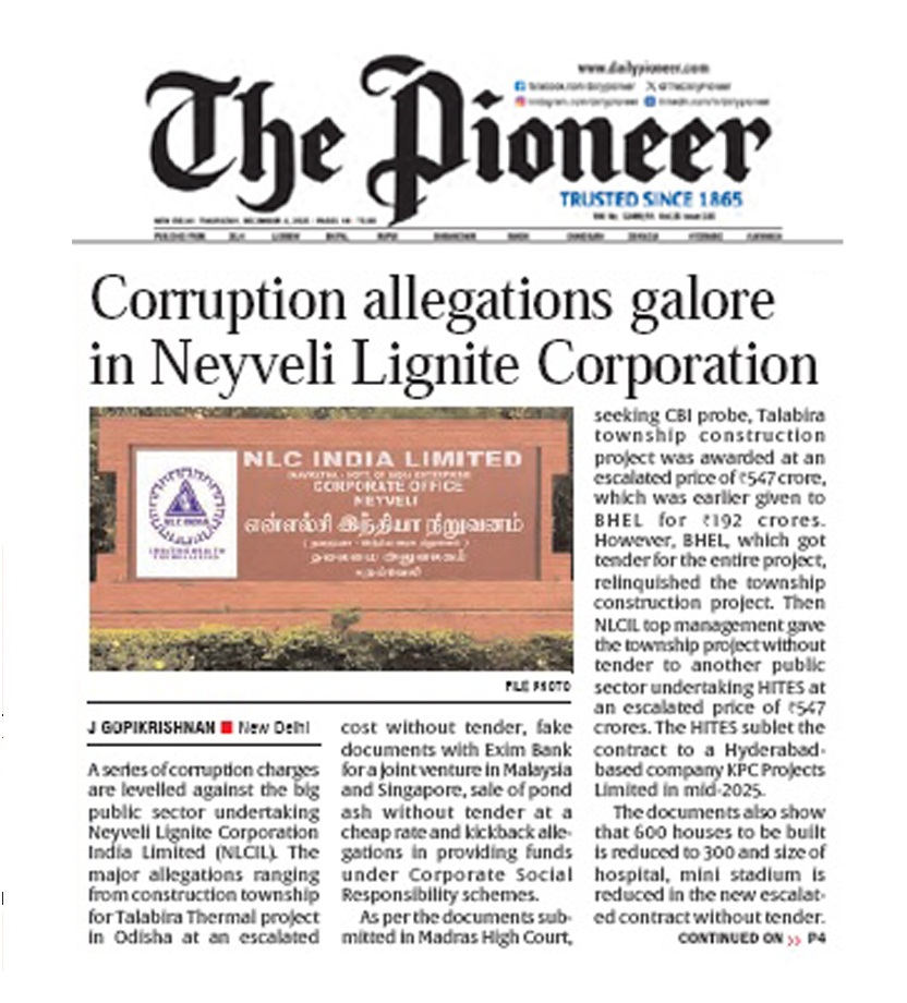 As per the documents submitted in Madras High Court, seeking a CBI probe, the Talabira township construction project was awarded at an escalated price of Rs. 547 crore, which was earlier given to BHEL for Rs192 crores. However, BHEL, which got the tender for the entire project, relinquished the township construction project. Then, NLCIL top management gave the township project without tender to another public sector undertaking HITES, at an escalated price of Rs. 547 crores. The HITES sublet the contract to a Hyderabad-based company, KPC Projects Limited in mid-2025.
